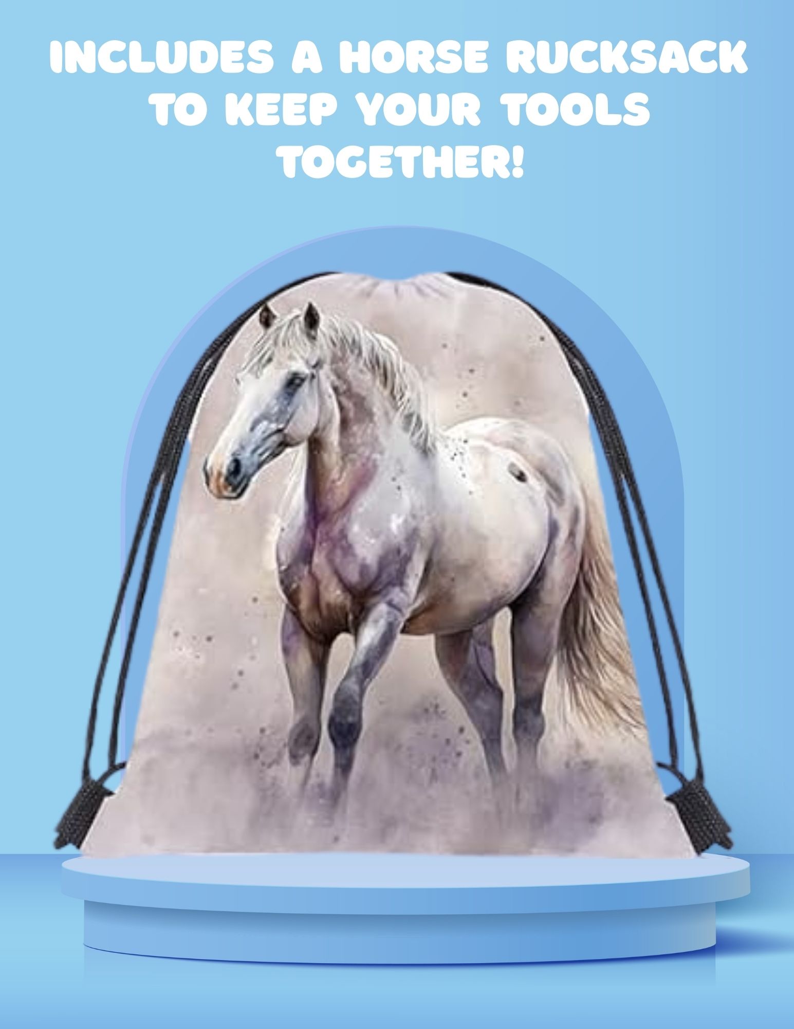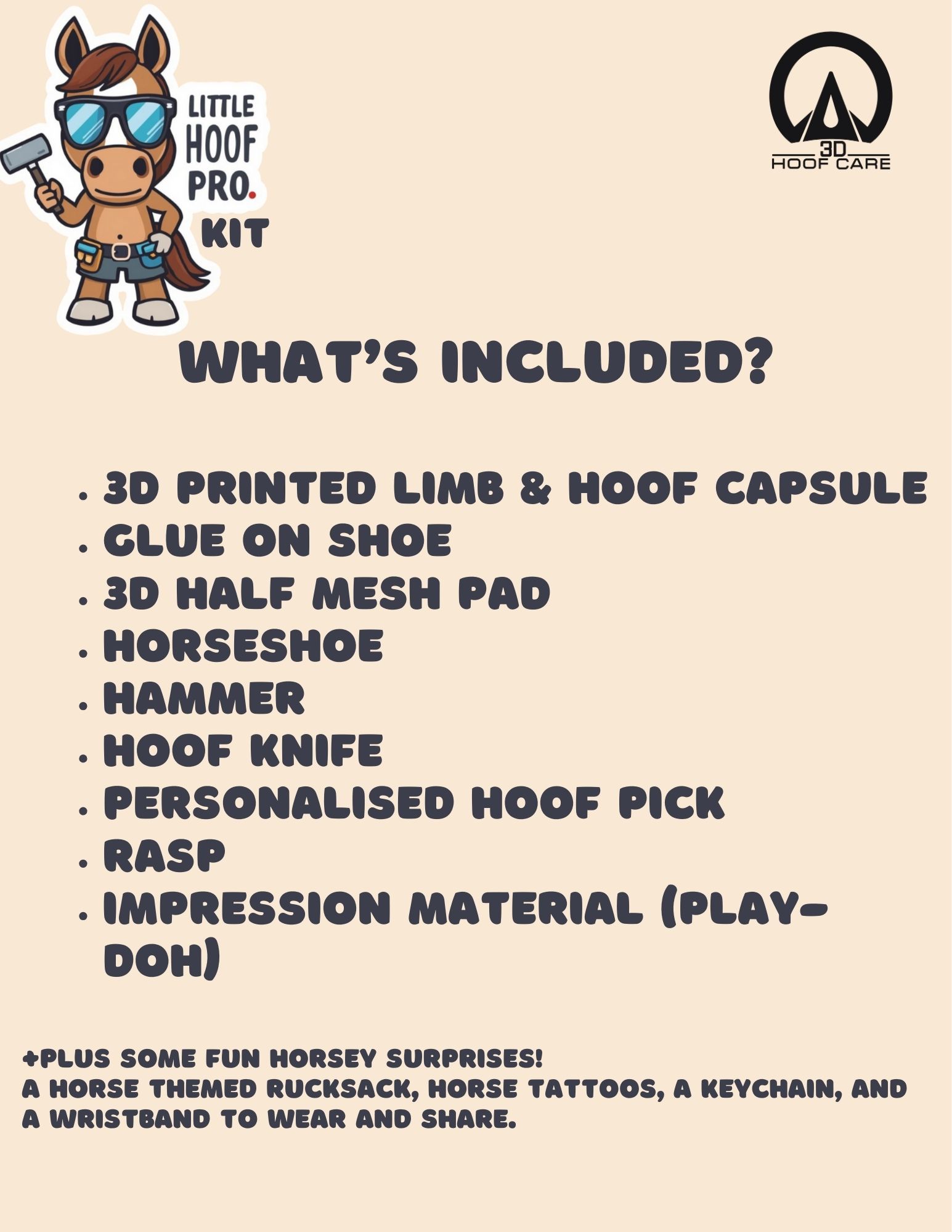 Buy NowBuy NowBuy NowThe Little Hoof Pro Kit is a hands-on, horse-loving learning kit designed for curious kids who want to explore hoof care through play. Whether they dream of being a farrier one day or just love horses, this kit turns learning into a creative, confidence-boosting experience. Inside, kids can practice trimming, fitting, and supporting a hoof using a 3D-printed limb and hoof capsule, just like the real thing, only perfectly sized for small hands. The 3D half mesh pad and horseshoe attach using Velcro, so they can be put on, taken off, and re-used again and again. No mess, no pressure, just learning at their own pace. The kit includes tools for realistic role play, including a hammer, hoof knife, rasp, glue-on shoe, impression material (play-doh), and a personalised hoof pick to make it feel extra special. It’s perfect for encouraging fine motor skills, problem solving, and imaginative play, all while learning how a horse’s hoof works. And because every little hoof pro needs accessories… Plus some fun horsey surprises! A horse themed rucksack, horse tattoos, a keychain, and a wristband to wear and share. ✨ Educational ✨ Reusable ✨ Kid friendly ✨ Designed to make learning hoof care fun Perfect for horse-obsessed kids, future farriers, and anyone who loves learning through play. *PLEASE ADD NAME FOR HOOF PICK IN THE NOTES SECTON AT CHECKOUT*